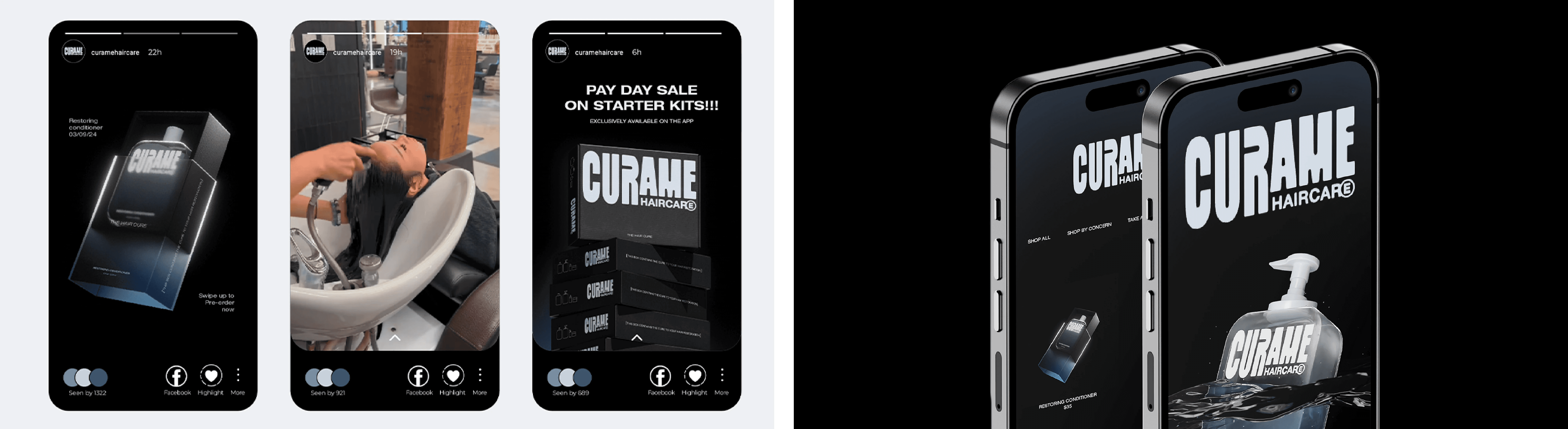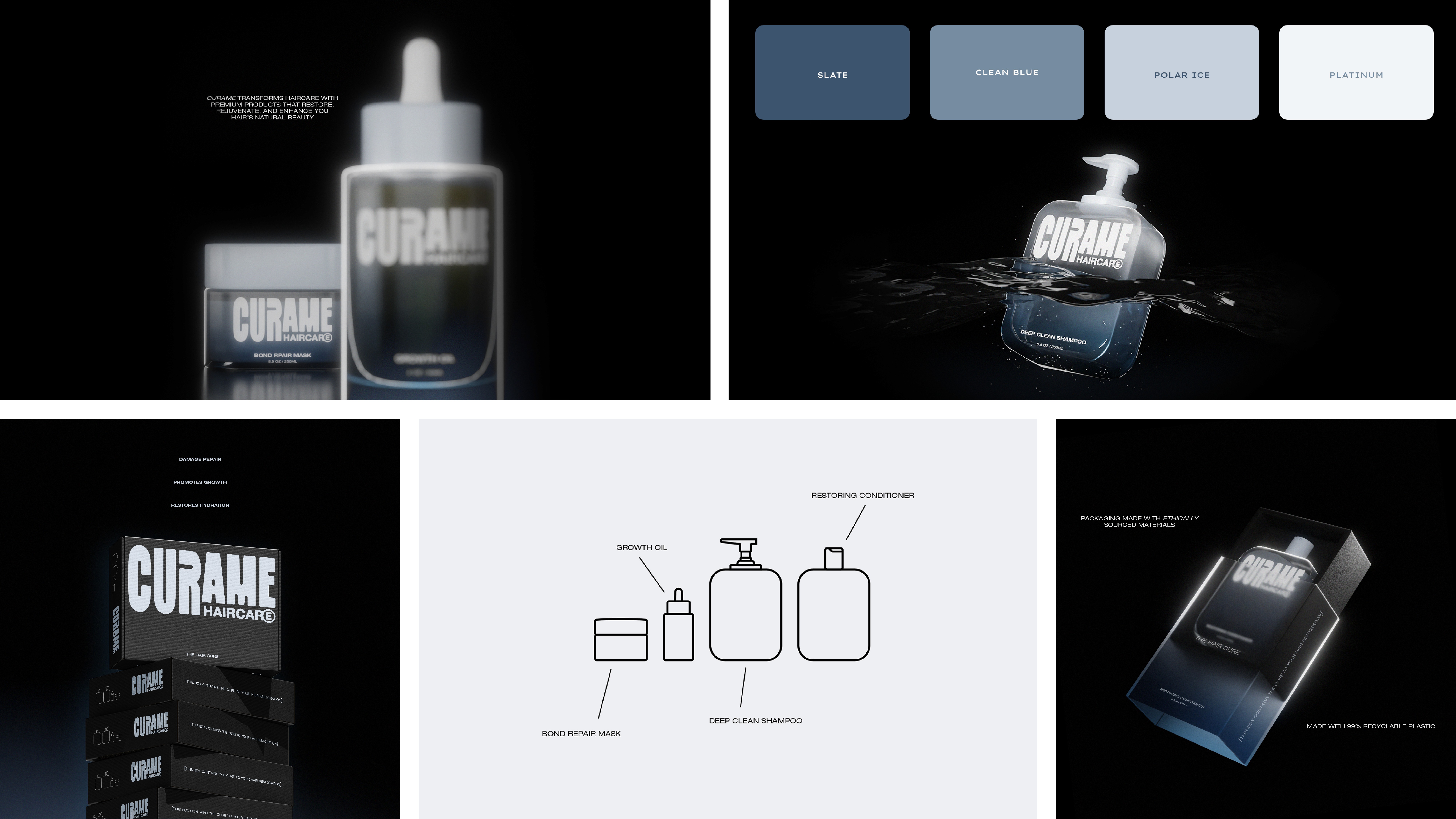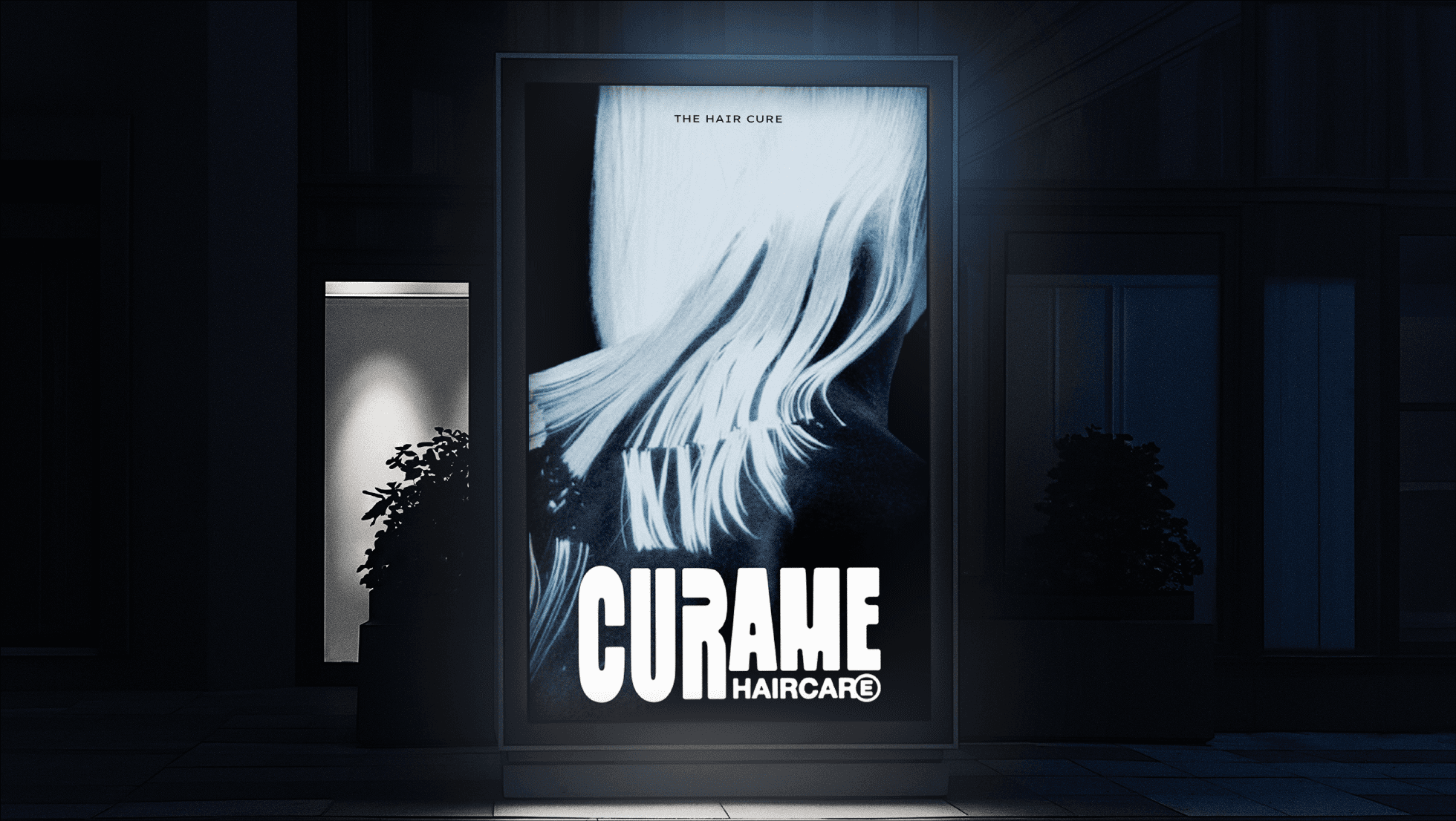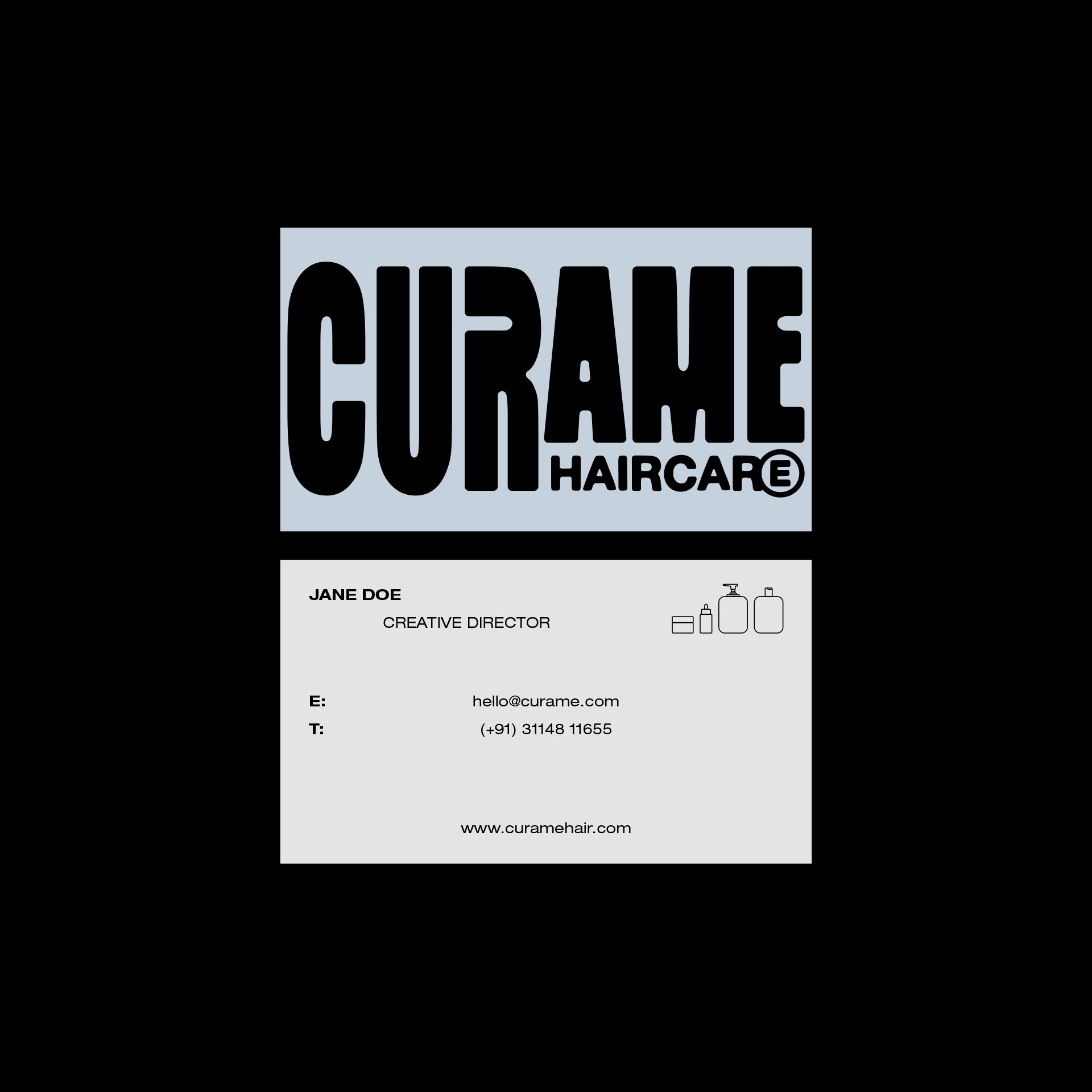 The logo created is bold and condensed design embodying strength and simplicity with the rest of the branding elements cohesively conveying the brand's commitment to empowering individuals to take control of their hair health, offering solutions that not only restore and rejuvenate but also build confidence. In a market saturated with quick fixes, CURAME stands out by offering true hair transformation- healthy, beautiful hair with strength and vitality.