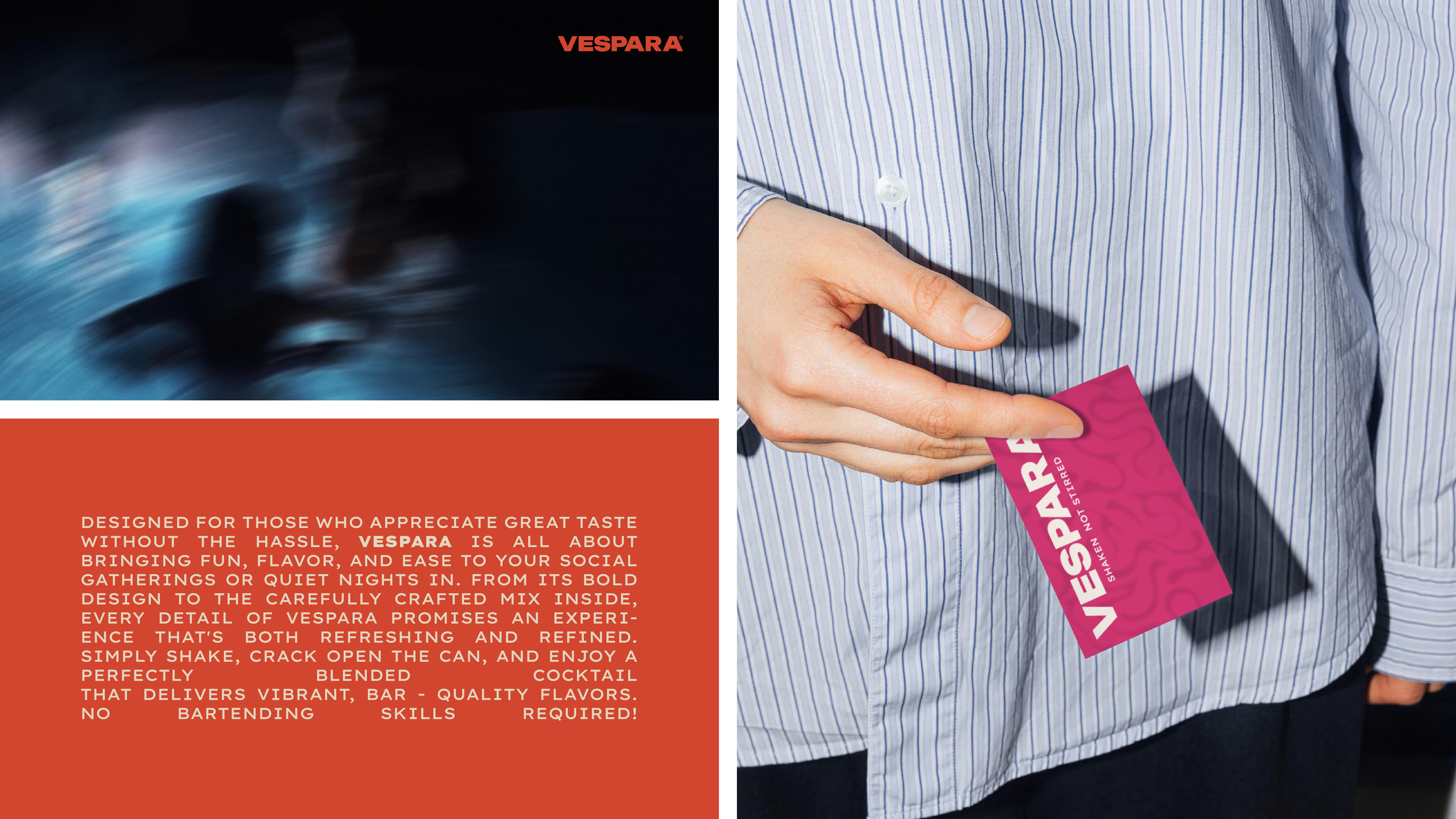 Introducing Vespara, a premium canned cocktail brand delivering bar-quality drinks with just a shake and pour. Perfectly crafted for any occasion, Vespara is designed for those who want convenience without compromising